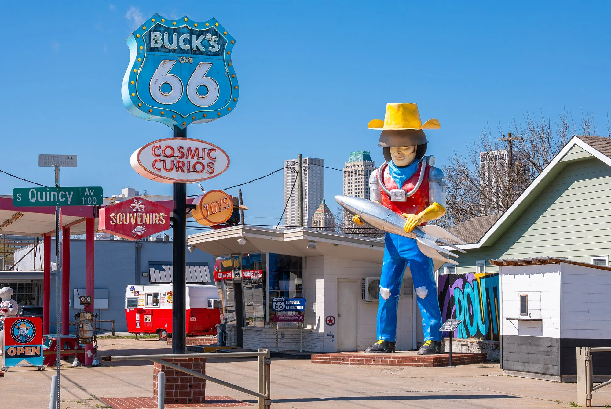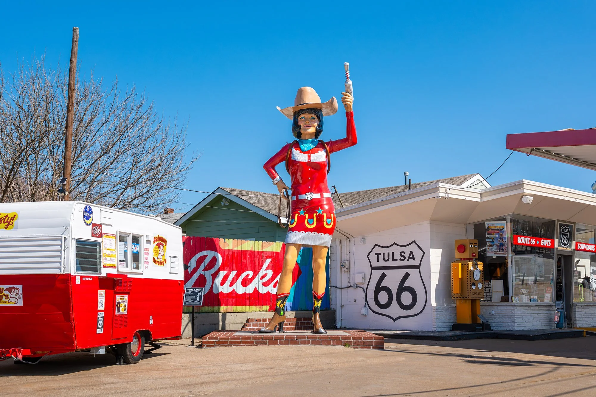 Often mentioned as one of the top attractions on Route 66, Buck Atom’s Cosmic Curios was created in 2008 by local Tulsa entrepreneur Mary Beth Babcock. Located in an old 1950s Pemco gas station, Buck’s quickly gained attention with the 2019 unveiling of the first “giant” in what was to become the Land of the Giants, Buck Atom, the cosmic cowboy. Buck stands 21-feet tall and has both a cowboy hat and a space helmet, as well as a custom rocket. Buck’s neon sign was designed by legendary neon artist Todd Sanders of Roadside Relics. Buck was joined by new 19-foot giant Stella Atom in 2024. Other characters at Buck’s include Piggy Stardust and a fun robot. Buck Atom’s Cosmic Curios store is filled with unique gifts, t-shirts, and much more. And, from March through November, Buck’s is joined by vintage food trailer Baloney Maroney’s smoked baloney sandwiches and more. Yum.