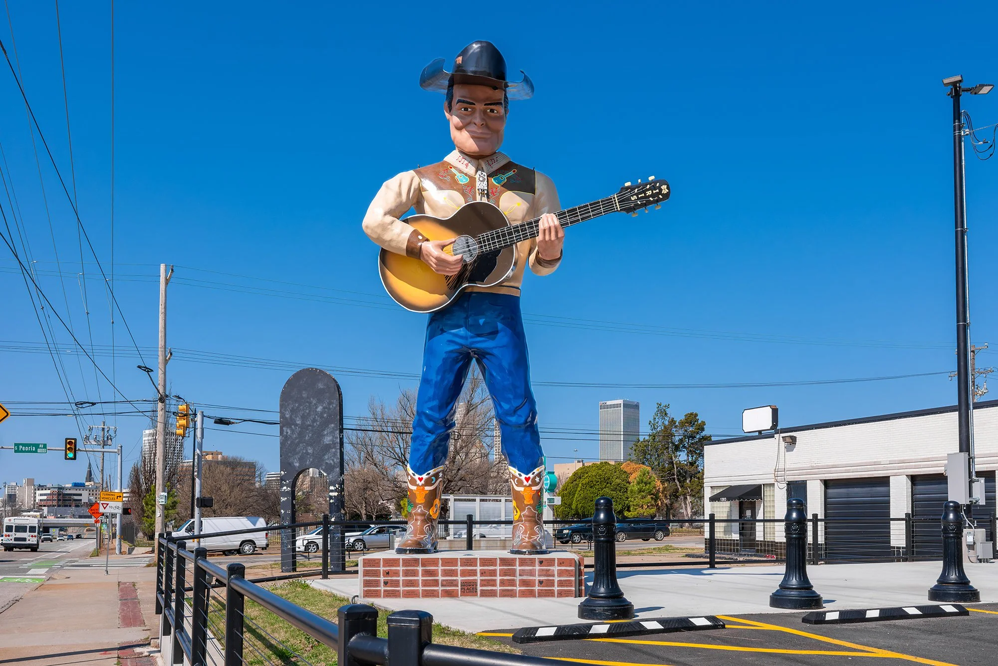 Cowboy Bob arrived in the Land of the Giants in 2025 and resides directly next to the 66 Collective shops on Route 66 and is part of Buck’s Vintage Western Wear. The story goes that Cowboy Bob was a country musician way back in the 1930s and came to Tulsa to play at the legendary Cain’s Ballroom. He liked it so much, he decided to make Tulsa his home. Cowboy Bob is made of fiberglass and stands 21-feet tall. He wears a vintage H Bar C western shirt, which has now been recreated by H Bar C and can be purchased at Buck’s Vintage. Bob also wears a pair of “Happy Trails” cowboy boots designed by Rocketbuster Boots, and plays a custom 8-foot guitar by Iris Guitars.