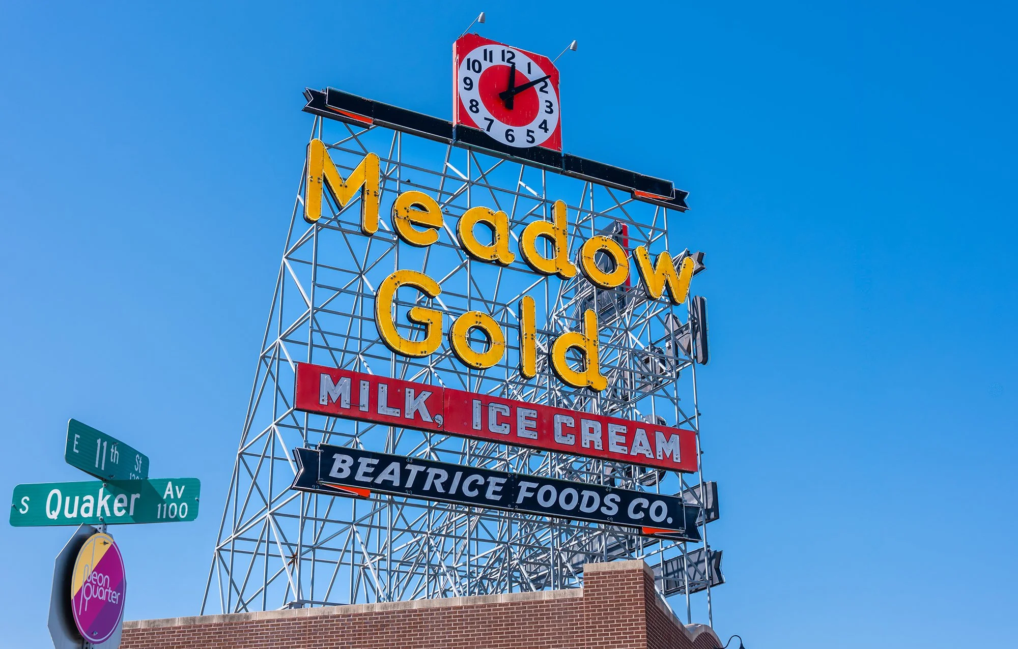 In 1934, Tulsa pioneer and civic leader Early Cass hired the Claude Neon company to create the iconic Meadow Gold sign at 11th and Lewis for the Beatrice Creamery Company. Legend has it that it was built angled in such a way that the nearby Hawk Dairy Company couldn't avoid seeing the brightly-lit neon when they looked out their window.